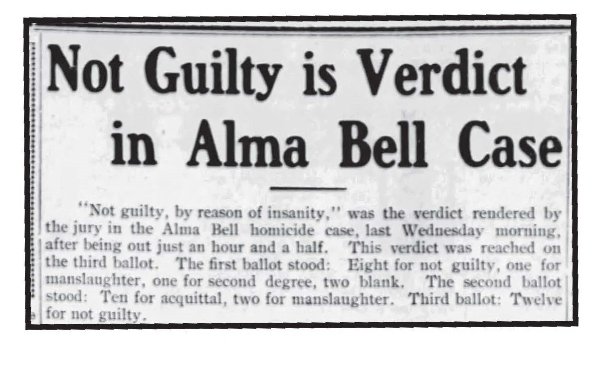 The case went to trial the second week of November 1909. On Nov. 27, the verdict “Not guilty by reason of insanity” was rendered. Alma Bell was a free woman. Later, she was quoted as saying, “I killed him because I believed I was right in doing so.”